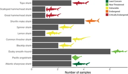 No total, 31% das amostras correspondiam a espécies em perigo ou em perigo crítico, como o tubarão-martelo-panã, o tubarão-martelo-comum, entre outros. Outras amostras pertenciam a espécies vulneráveis, como o tubarão-limão e o tubarão-tintureira, ou quase ameaçadas, como o tubarão-anjo-do-Pacífico. Apenas uma amostra provinha de uma espécie considerada de “menor preocupação”: o tubarão-pontiagudo-do-Atlântico.
