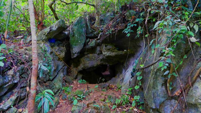 A entrada florestal da caverna Coc Muoi, localizada a cerca de 10 metros acima da planície cultivada circundante. Escondida nas colinas calcárias da província de Lang Son, no Vietname, a caverna preservou restos fósseis de mamíferos do Pleistoceno que fornecem informações vitais sobre como as espécies responderam às mudanças climáticas e ambientais do passado.Crédito: Truong Huu Nghia, Anthropological and Palaeoenvironmental Department of Vietnam’s Institute of Archaeology