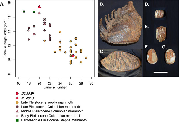 Figura 1. Morfologia molar. (A) Gráfico bivariado do número de lamelas versus índice de comprimento de lamelas para terceiros molares superiores de um conjunto de dados comparativos de Mammuthus spp. (ver material eletrônico suplementar, S2, para mais detalhes) e molar BC35.9k (RBCM.P997). (B) Vistas lateral e (C) oclusal de M3 de BC35.9k . (D) Vistas oclusal, (E) lateral, (F) posterior e (G) anterior do fragmento M3 BC25.3k (AA.71.255.1). Em (D) e (E) o anterior está à esquerda. Barra de escala (B–G) 100 mm.