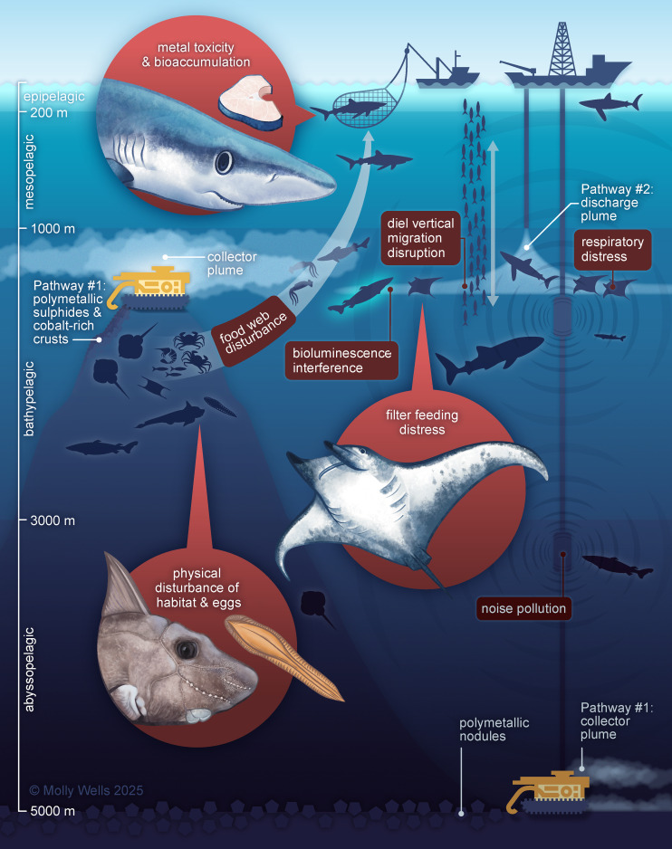 O estudo destaca casos preocupantes: algumas espécies colocam os ovos diretamente no leito marinho ou dependem de corais profundos para se reproduzir. A mineração de sulfuretos polimetálicos, por exemplo, ocorre junto a fontes hidrotermais onde já foram descobertas maternidades naturais de raias. A destruição destes locais pode comprometer o ciclo de vida de populações inteiras.